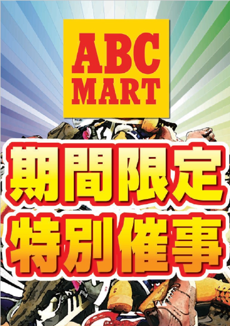 20240309 ABCMART期間限定特別催事 ABCMART期間限定特別催事のご案内 ■日時:2024年3月9日(土)~3月31日(日) ■各日:10時~21時 ■場所:1階セントラルコート レディス、メンズ、スポーツシューズを品揃え豊富にお取り揃えいたします。ぜひお越しくださいませ。 ※写真はイメージです。