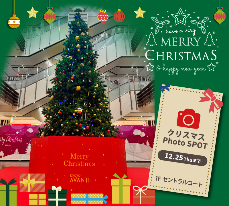 2025.12.8 『クリスマスフォトスポット』 「クリスマスフォトスポット」のご案内 今年も京都AVANTIに高さ5メートルの クリスマスツリーが1Fセントラルコートに登場! クリスマスまでの期間限定のフォトスポット、ぜひお楽しみください。 日時 │2025年11月26日(水)~12月25日(木) 各日 │10時~21時 場所 │1階セントラルコート