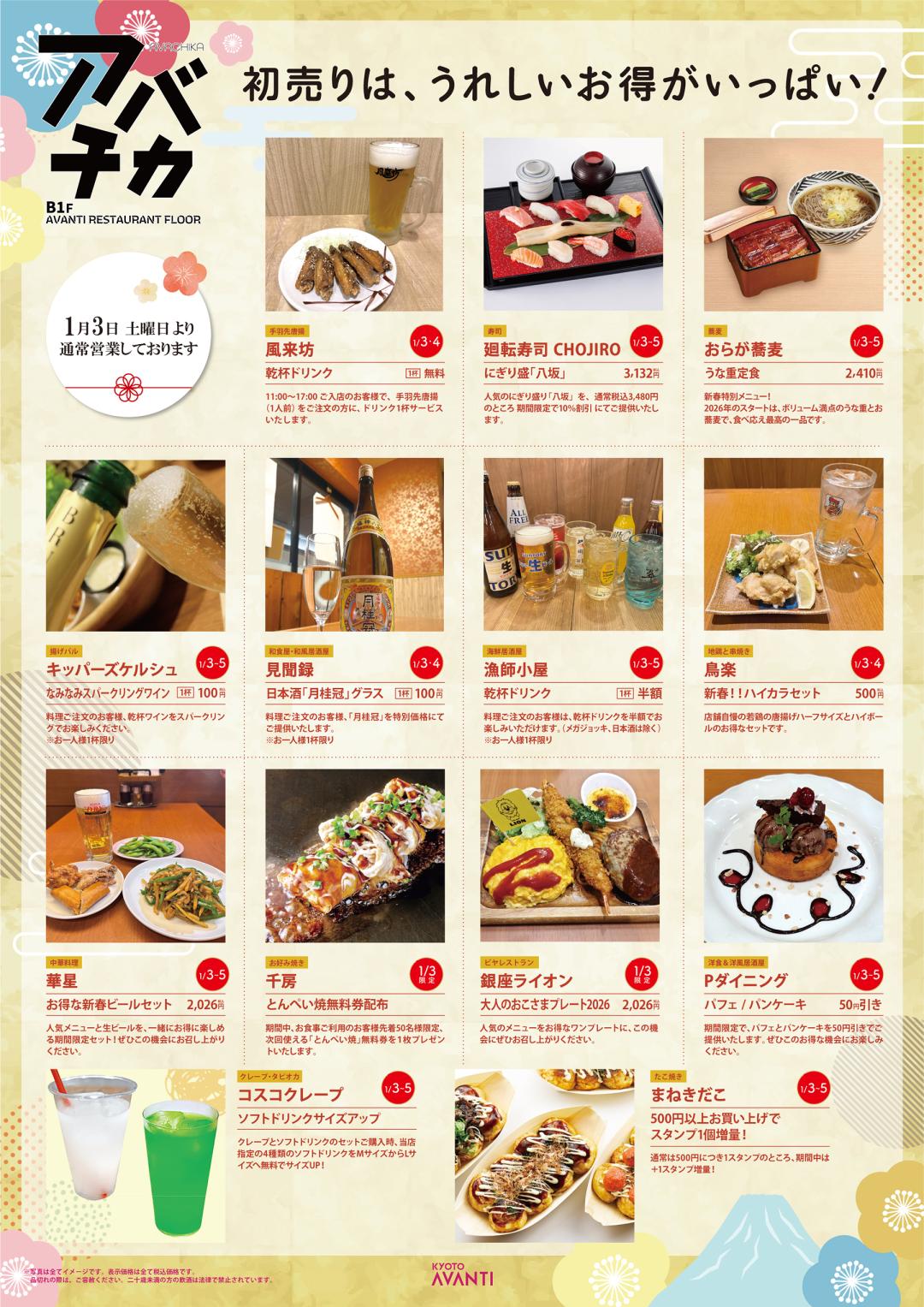 2025.12.26 『2026年初売り情報』 『2026年初売り情報』のご案内 1月3日(土)より、初売りを開催いたします。 アバチカレストラン街、フードコートで期間中はお得な商品などをご用意しております。 ぜひこの機会にご利用ください。